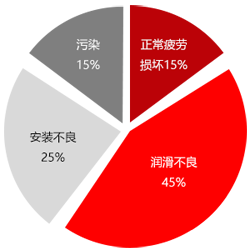 我們通常談論的軸承壽命是指一個軸承中任一滾動體或任一滾道在出現疲勞剝落以前達到的總轉數,或在一定轉速下的工作小時數。大部分教科書所討論的軸承壽命也是圍繞疲勞壽命展開的理論設計壽命。然而,很多場合軸承的實際使用壽命與理論上的疲勞壽命相差很遠,據統計,80%以上的軸承提前失效不是由于軸承正常疲勞引起的。如右圖所示,只有15%的軸承損壞是理論上的疲勞損壞,大部分軸承在沒有運轉到軸承疲勞損壞之前就已經由于潤滑不良、安裝不當或受到污染而損壞。